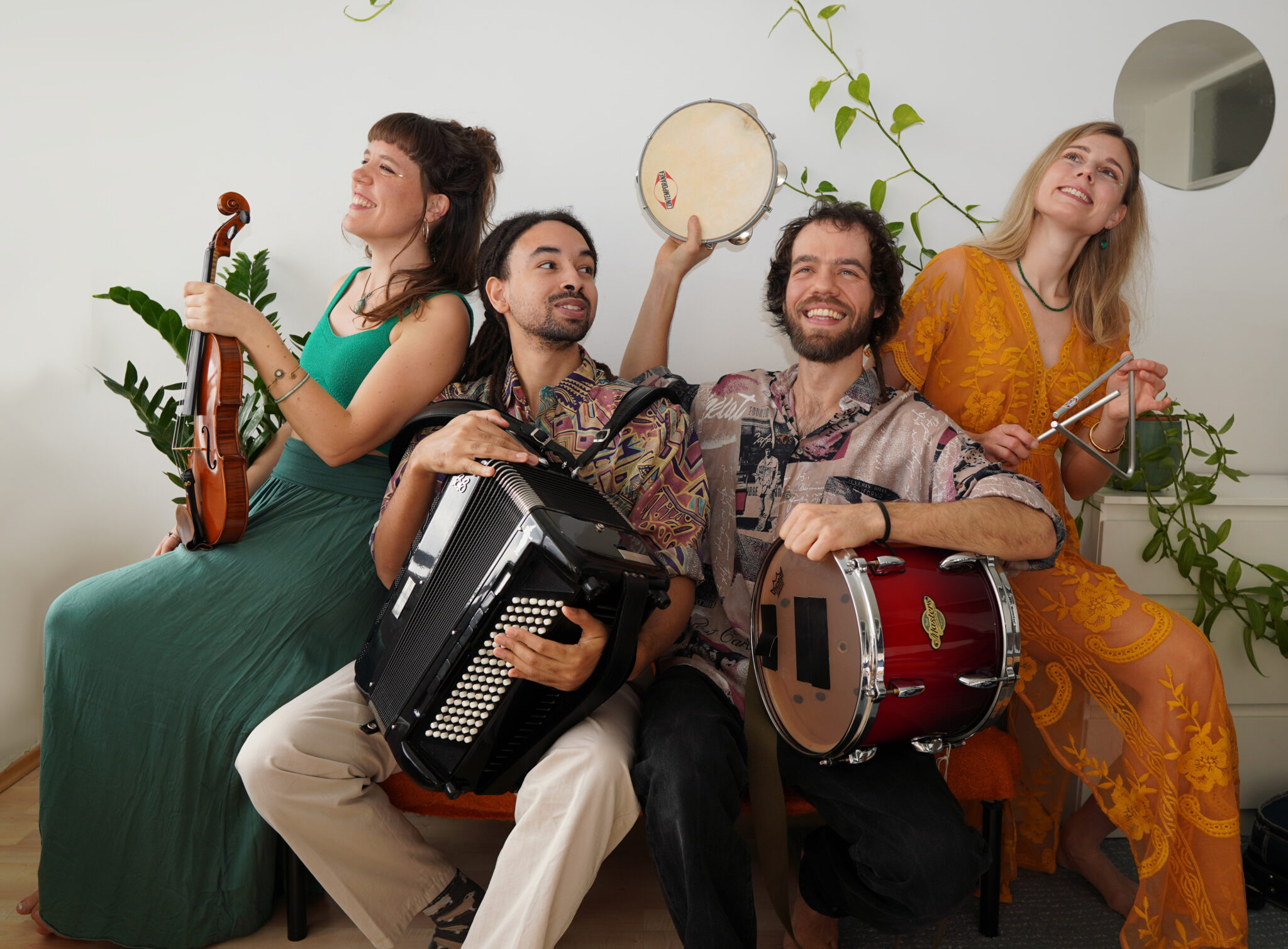 Tobias entlockt dem Akkordeon die charakteristischen Harmonien, während Christine mit ihrer sanften Stimme und dem hellen Klang der Triangel die Stücke belebt. Katias Violine verleiht der Musik eine besondere Farbe und auch ihre Stimme fügt sich warm in den Gesamtklang ein. Jan gibt mit der tiefen, treibenden Zabumba den Herzschlag des Forró vor.
